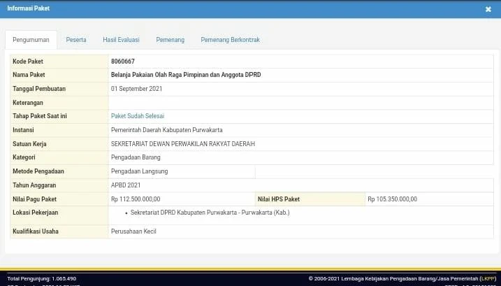 Dilansir dari laman Layanan Pengadaan Secara Elektronik (LPSE) Kabupaten Purwakarta,anggaran belanja pakaian olah raga pimpinan dan anggota DPRD sebesar Rp.112.500.000 APBD 2021.